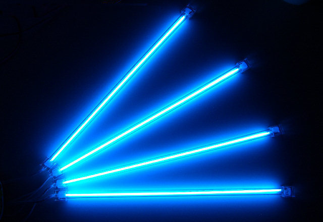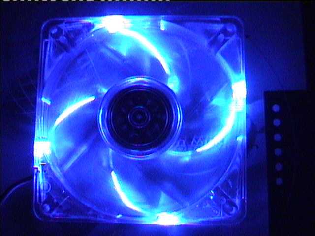 Die Beleuchtung des Gehäuses erfolgt durch Kaltlichtkathoden (2 Stück ca. 10 Euro) und einen beleuchteten Lüfter, der den im Netzteil eingebauten 8 cm Lüfter ersetzt.